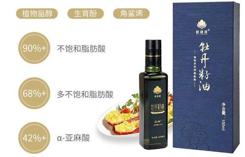 不同品種的食用油,其脂肪酸構成和微量營養(yǎng)成分有所不同。某些植物油除了含有上述脂肪伴隨物外,還含有一些獨特的功能性成分,比如牡丹籽油,不僅具有食用價值,還具有醫(yī)療保健價值,其主要原因正是在于牡丹籽油里所包含的多種營養(yǎng)成分:α-亞麻酸、亞油酸、油酸、以及角鯊烯、植物甾醇、丹皮酚、牡丹皂甙等物質。