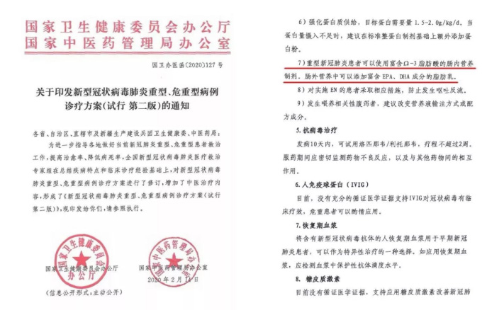 原文指出:“重型新冠肺炎患者可以使用富含Ω-3(Omega-3)脂肪酸的腸內(nèi)營養(yǎng)制劑。