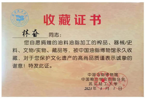 行油脂人之嘉行 展油脂文化傳承后人 | 中國油脂博物館為中國資國業(yè)頒發(fā)收藏證書