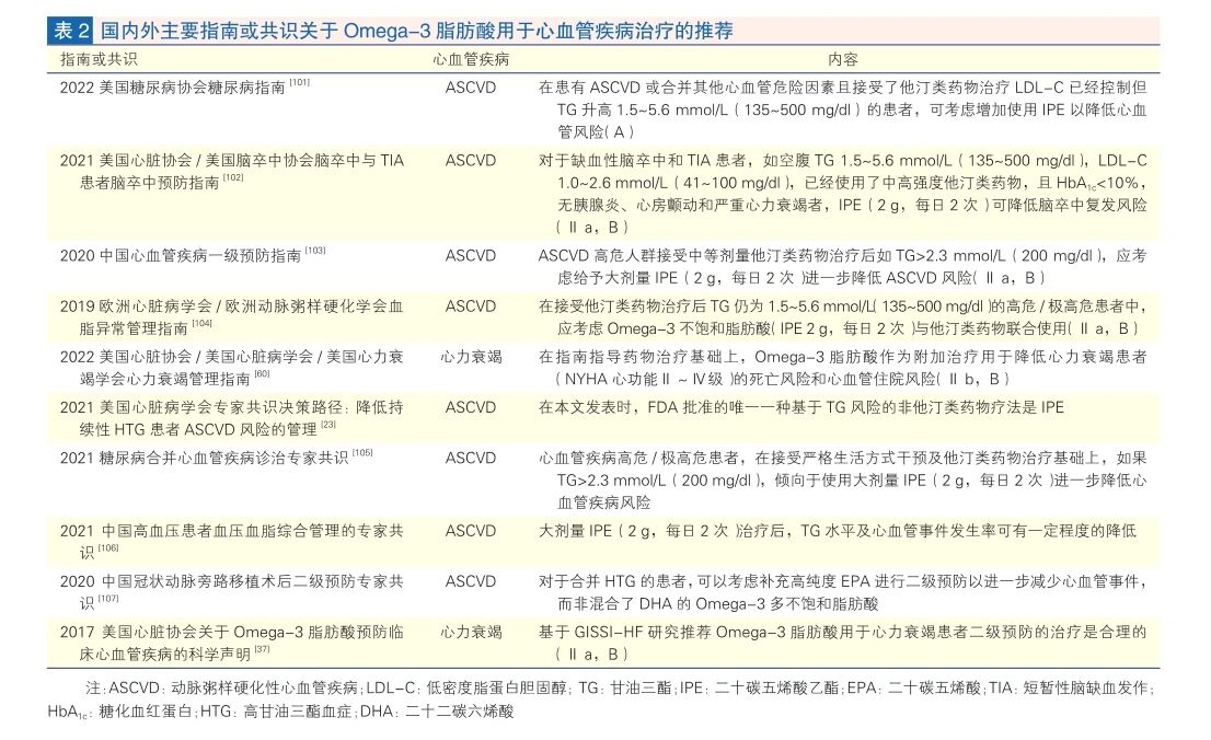 我國(guó)心血管病專家委員會(huì)、心血管代謝醫(yī)學(xué)專業(yè)委員會(huì)指出omega-3脂肪酸能顯著降低甘油三酯水平。2022美國(guó)心臟學(xué)會(huì)/美國(guó)心臟病學(xué)會(huì)/美國(guó)心力衰竭學(xué)會(huì)心力衰竭指南提出,omega-3脂肪酸可以作為心力衰竭附加治療。