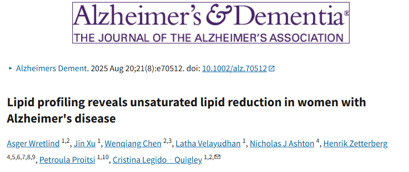 2025年8月,英國(guó)倫敦國(guó)王學(xué)院團(tuán)隊(duì)在《阿爾茨海默病與癡呆》(Alzheimer's & Dementia )發(fā)表的最新研究顯示,女性阿爾茨海默病患者血漿中多種高度不飽和脂質(zhì)水平顯著降低,而飽和脂質(zhì)水平升高,男性中未發(fā)現(xiàn)這種變化,且較高的高度不飽和脂質(zhì)水平與更好的認(rèn)知功能相關(guān),而飽和脂質(zhì)與較差的認(rèn)知功能相關(guān)。